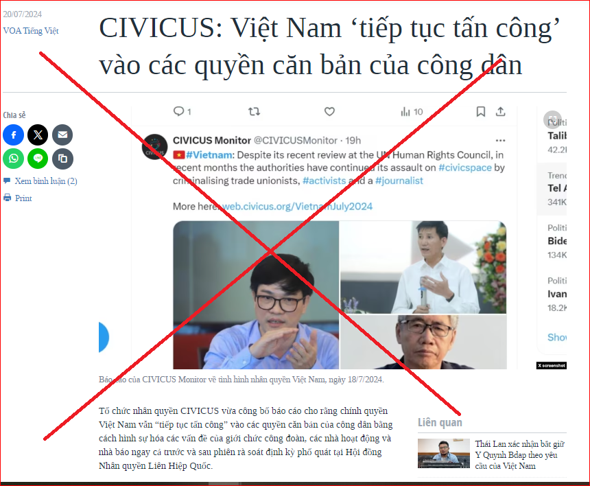 Như vậy là trong vòng hơn một năm, CIVICUS đã có ít nhất 3 lần xuyên tạc, nói không đúng về tình hình Việt Nam. Thậm chí, CIVICUS còn vu cáo: “Tại Việt Nam, chính quyền đã gây áp lực lên các nền tảng truyền thông xã hội”, “hơn 100 nhà bảo vệ nhân quyền vẫn đang bị giam cầm, bị phân biệt đối xử trong trại giam”. Tổ chức này bênh vực, đòi thả tự do cho số đối tượng vi phạm pháp luật Việt Nam khi có các hành vi phạm tội tuyên truyền chống nhà nước, lợi dụng các quyền tự do dân chủ như Trương Văn Dũng, Trần Văn Bang, Phan Sơn Tùng, Lê Hữu Minh Tuấn và gần đây là Trần Đình Triển, Trương Huy San…; đưa ra luận điệu sai trái khi cho rằng quyền tự do của người dân bị bóp nghẹt, bị chính quyền đàn áp. Chưa hết, tại phiên họp cấp cao Khóa 55 Hội đồng Bảo an Liên Hợp quốc ngày 26/2/2024 ở Geneva, Thụy Sỹ, Bộ trưởng Ngoại giao Bùi Thanh Sơn chia sẻ rằng Việt Nam đã nộp Báo cáo quốc gia theo cơ chế Rà soát định kỳ phổ quát (UPR) chu kỳ IV, trong đó đã thực hiện hoàn toàn gần 90% số khuyến nghị nhận được năm 2019. Lập tức CIVICUS thông qua cái loa RFA đã tung ra các bài viết công kích tình hình nhân quyền Việt Nam,m tiếp sức cho RFA lu loa “Việt Nam cần thả các tù nhân lương tâm nếu muốn tái cử vào Hội đồng Nhân quyền!”, rồi khai thác phát biểu của Josef Benedict, chuyên gia vận động cho không gian dân sự khu vực châu Á-Thái Bình Dương của CIVICUS quy chụp rằng: “Thành tích nhân quyền của quốc gia này thật kinh khủng và tình trạng không gian dân sự ở nước này được CIVICUS Monitor đánh giá là “đóng””…