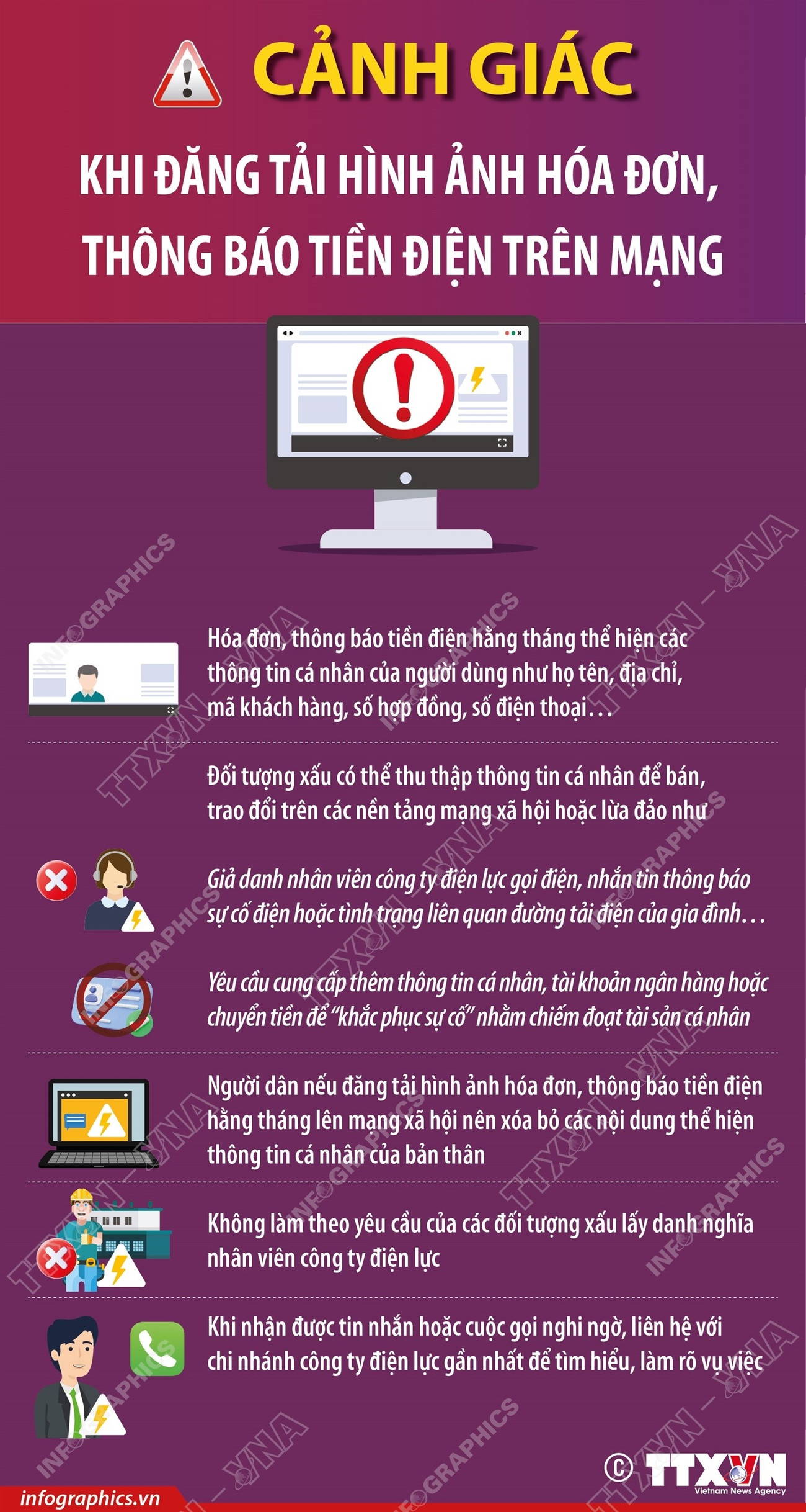 Người dân cần cẩn trọng khi chia sẻ hóa đơn, thông báo tiền điện để tránh lộ thông tin cá nhân và rủi ro dễ bị các đối tượng xấu lợi dụng.