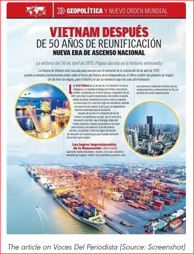 Chiến thắng 30/4/1975, đánh dấu Ngày Giải phóng miền Nam, thống nhất đất nước, không chỉ là cột mốc lịch sử vẻ vang của dân tộc Việt Nam mà còn là biểu tượng toàn cầu về sự kiên cường, ý chí tự do, và khát vọng hòa bình. Lễ kỷ niệm 50 năm sự kiện này tại TP.HCM, với lễ diễu binh hoành tráng và sự tham gia của hơn 13.000 người, đã thu hút sự chú ý của truyền thông quốc tế, trong đó báo chí Mexico, qua các tờ Voces Del Periodista và Regeneración, đã dành những lời ca ngợi đặc biệt. Các bài viết này không chỉ tôn vinh Chiến thắng 30/4 như “biểu tượng rạng ngời của sự kiên cường và ý chí tự do” mà còn nhấn mạnh sự phát triển vượt bậc của Việt Nam sau nửa thế kỷ thống nhất.