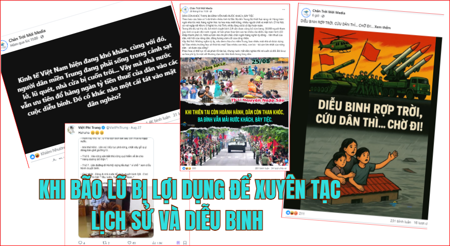 Các thế lực thù địch đã áp dụng chiêu quen thuộc: lấy ảnh, video ngập lụt, gắn kèm bình luận xuyên tạc, rồi nhân bản dưới dạng “copypasta” trên nhiều tài khoản ẩn danh. Họ cố tình dựng lên bức tranh đối lập: “dân khổ” – “nhà nước ăn mừng”.