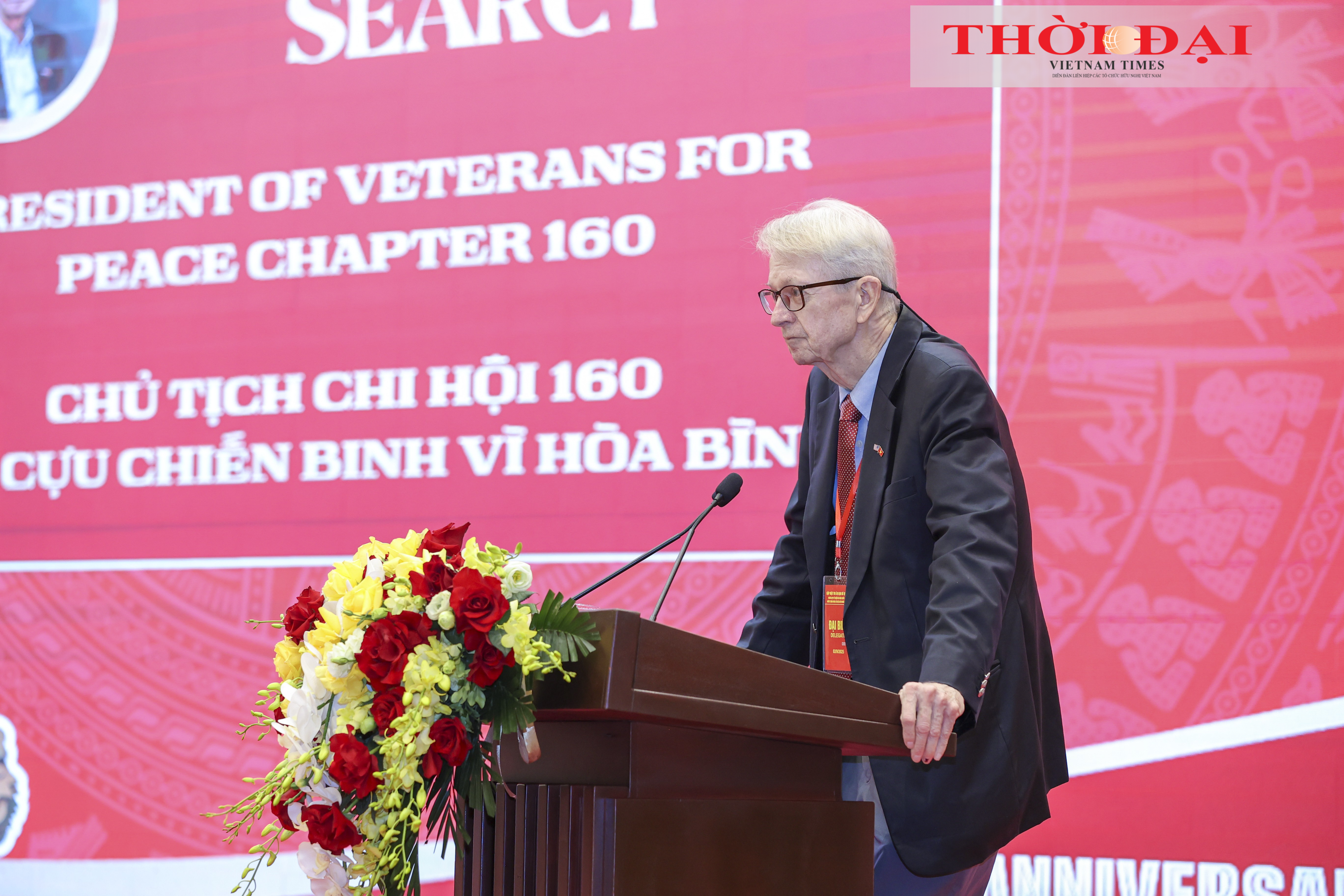| Ông Chuck Searcy, Chủ tịch Chi hội 160 – Hội Cựu chiến binh vì hòa bình phát biểu tại cuộc “Gặp mặt tri ân bạn bè quốc tế nhân dịp kỷ niệm 80 năm Quốc khánh nước Cộng hòa xã hội chủ nghĩa Việt Nam”. |