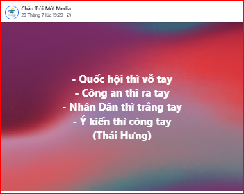 Một câu vè nghe tưởng dí dỏm nhưng lại ẩn chứa đầy định kiến sai lệch: “Quốc hội thì vỗ tay/ Công an thì ra tay/ Nhân dân thì trắng tay/ Ý kiến thì còng tay”. Thái Hưng dùng vần điệu này trên trang Chân Trời Mới Media ngày 29/7/2025 để gieo rắc hoài nghi, xuyên tạc bản chất của Nhà nước pháp quyền xã hội chủ nghĩa, bóp méo thực tiễn dân chủ và vu khống lực lượng công quyền.