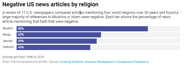 Các bài báo đề cập đến người Hồi giáo cũng có nhiều khả năng là tiêu cực hơn nhiều so với những câu chuyện cảm động về bất kỳ nhóm nào khác mà 2 ông đã kiểm tra. Đối với người Công giáo, người Do Thái và người theo đạo Hindu, tỷ lệ các bài báo tích cực và tiêu cực là gần 50-50. Ngược lại, 80% tất cả các bài báo liên quan đến người Hồi giáo là tiêu cực. Các phương tiện truyền thông không có xu hướng đăng những câu chuyện tiêu cực khi họ viết về các tôn giáo thiểu số khác, nhưng họ rất có thể làm như vậy khi họ viết về người Hồi giáo.