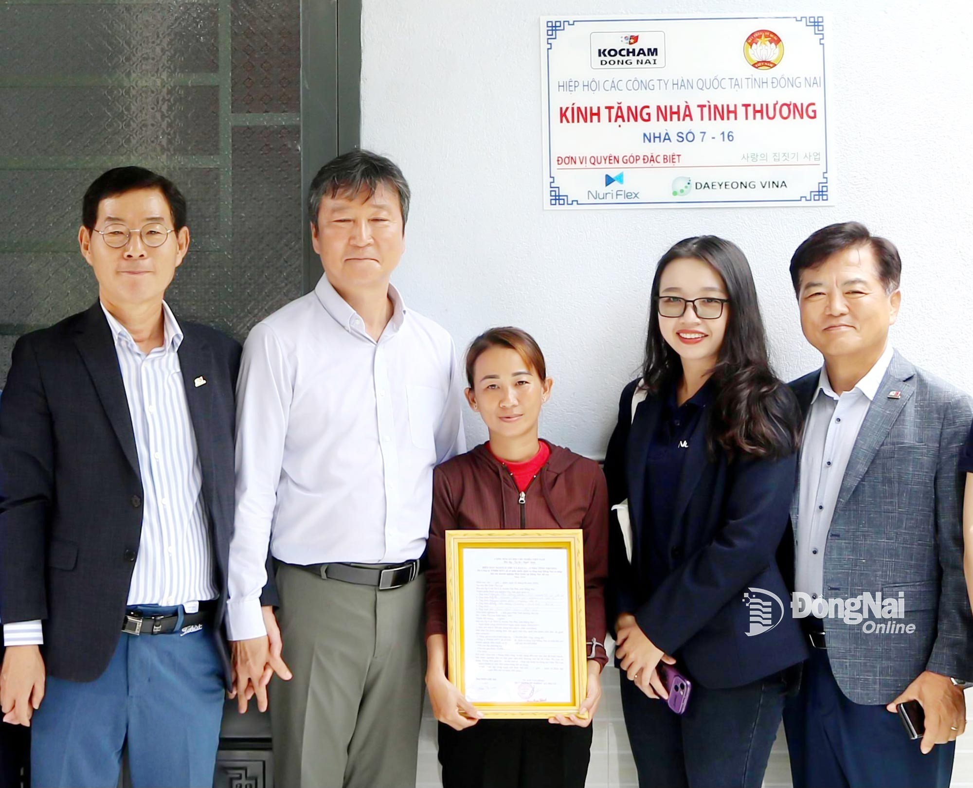 | Đại diện Hiệp hội Thương mại Hàn Quốc tại Việt Nam và Hiệp hội các doanh nghiệp Hàn Quốc tại Đồng Nai cùng chính quyền địa phương trao biên bản bàn giao nhà cho một người dân xã Định Quán |