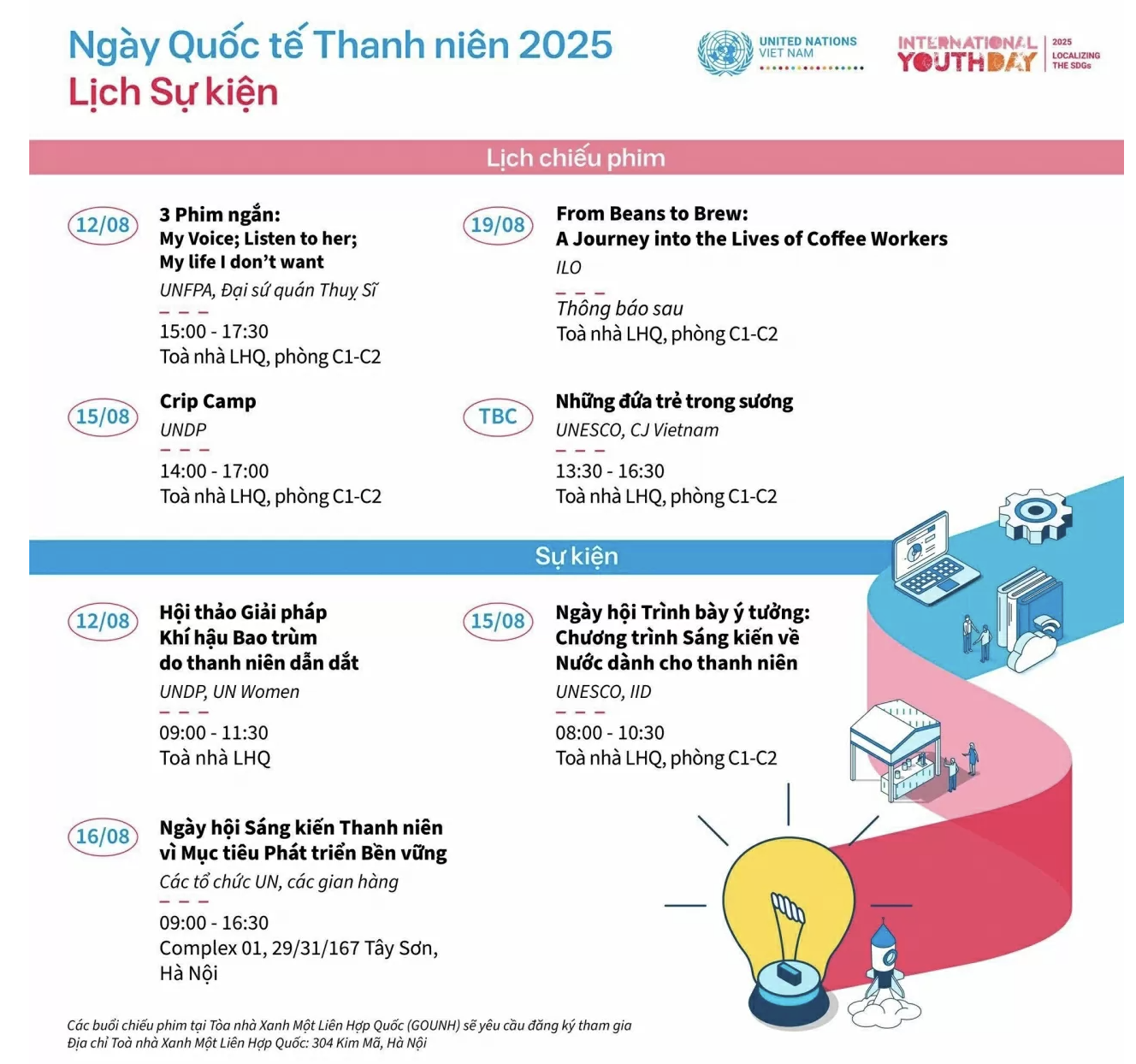 Các hoạt động do Nhóm công tác vì thanh thiếu niên của Liên hợp quốc tại Việt Nam (UNTGAY) tổ chức bao gồm các buổi chiếu phim, tọa đàm tương tác và triển lãm ngoài trời, giới thiệu hơn 30 sáng kiến do thanh niên dẫn dắt từ khắp mọi miền đất nước.