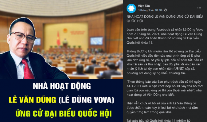 Chuyên gia “buôn tin giả” trên mạng, Lê Dũng Vova ngày 02/03/2021 đã thông báo rằng mình vừa hoàn thành hồ sơ ứng cử Đại biểu Quốc hội Khóa 15. Tin này đã được đăng lại trên một số...