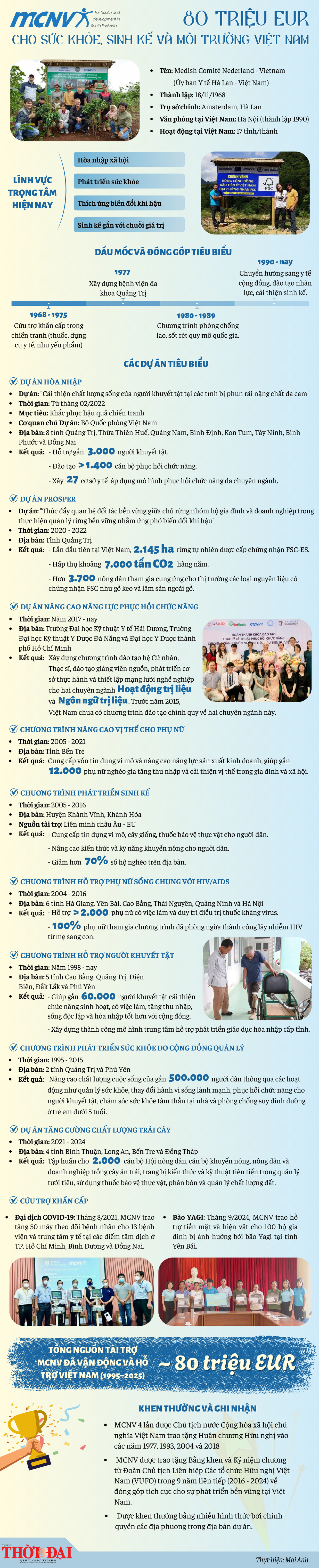 Với nguồn tài trợ khoảng 80 triệu EUR trong gần 6 thập kỷ, tổ chức MCNV đã đồng hành cùng Việt Nam trên bốn trụ cột: phát triển sức khỏe, hòa nhập xã hội, thích ứng biến đổi khí hậu và phát triển sinh kế, đem lại lợi ích thiết thực cho hàng trăm nghìn người dân.