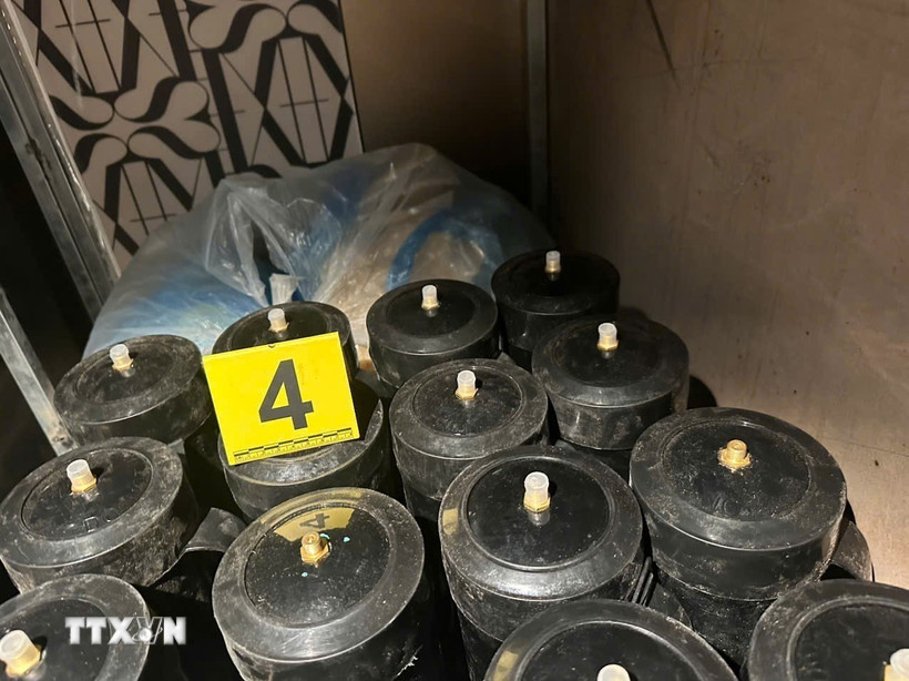 Tang vật thu giữ gồm 8 bình khí N2O loại 5,5kg, 6 vỏ bình đã qua sử dụng, 20 bịch bóng cao su, 333 quả bóng đã dùng, 5 điện thoại di động, nhiều thiết bị POS, hóa đơn thanh toán và các dụng cụ liên quan.