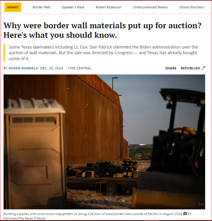 Tờ báo địa phương bang Texas ngày 20/12/2024 đăng bài báo đề cập đến tranh cãi xoay quanh việc bán đấu giá các vật liệu xây dựng tường biên giới ở Mỹ. Một số nhà lập pháp Texas, bao gồm Phó Thống đốc Dan Patrick, chỉ trích chính quyền Biden vì hành động này. Việc bán vật liệu này được Quốc hội thông qua từ năm 2023, theo Đạo luật Ủy quyền Quốc phòng Quốc gia với các điểm chính: